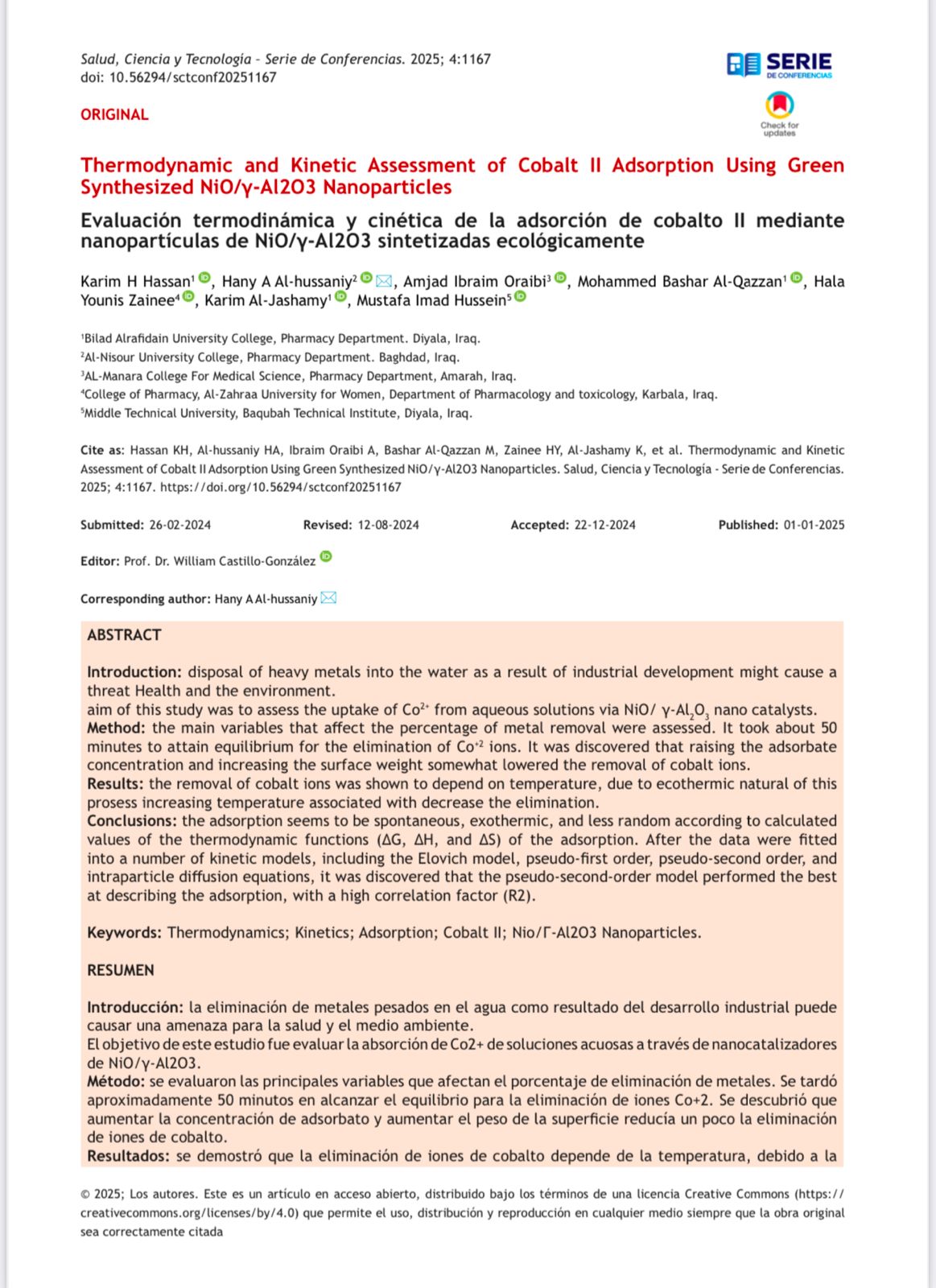 نشرت التدريسية م.م. هالة يونس زيني من كلية الصيدلة بجامعة الزهراء (عليها السلام) للبنات بحثًا علميًا بعنوان: "Thermodynamic and Kinetic Assessment of Cobalt II Adsorption Using Green Synthesized NiO/γ-Al2O3 Nanoparticles"   في مجلة "Salud, Ciencia y Tecnología - Serie de Conferencias"، المصنفة ضمن مستوعبات سكوبس (الربع الثالث).   ملخص البحث: يتناول البحث مشكلة التخلص من المعادن الثقيلة في المياه الناتجة عن التطور الصناعي، والتي تمثل تهديدًا للصحة العامة والبيئة. وهدف البحث إلى تقييم عملية امتصاص أيونات الكوبالت (Co²⁺) من المحاليل المائية باستخدام محفزات نانوية من نوع NiO/γ-Al2O3 المحضرة بطرق صديقة للبيئة.   الطريقة:   تم دراسة العوامل المؤثرة على نسبة إزالة أيونات الكوبالت، حيث تبين أن الوصول إلى حالة التوازن يتطلب حوالي 50 دقيقة.   لوحظ أن زيادة تركيز المادة الممتصة أو وزن السطح الممتص يؤدي إلى انخفاض فعالية إزالة أيونات الكوبالت إلى حد معين.     النتائج:   أظهرت الدراسة أن فعالية الامتصاص تتأثر بدرجة الحرارة بسبب الطبيعة الحرارية للعملية، حيث يؤدي ارتفاع درجات الحرارة إلى انخفاض كفاءة الإزالة.   أظهرت القيم الديناميكية الحرارية (∆G و∆H و∆S) أن الامتصاص تلقائي، طارد للحرارة، وأقل عشوائية.     الاستنتاجات:   كان نموذج الامتصاص شبه الترتيب الثاني الأكثر دقة في وصف العملية، مع تحقيق عامل ارتباط مرتفع (R²).   تشير النتائج إلى إمكانية استخدام هذه التقنية كحل بيئي لمعالجة المياه الملوثة بالمعادن الثقيلة.     هذا الإنجاز العلمي يعكس جهود الباحثين في الجامعة لتعزيز البحث العلمي ومواكبة القضايا البيئية المعاصرة.