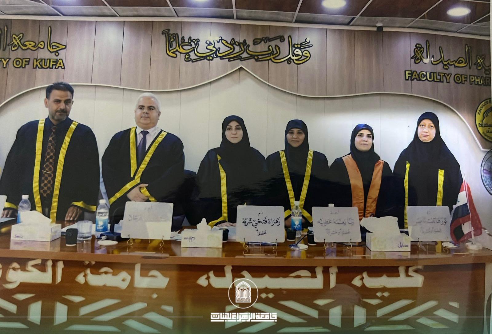 شاركت الأستاذة الدكتورة نور هاتف الدباغ، عميد كلية الصيدلة/جامعة الزهراء (عليها السلام) للبنات، في مناقشة رسالة ماجستير في كلية الصيدلة بجامعة الكوفة، بصفتها عضوًا ومشرفًا. وحملت الرسالة عنوان: "تصميم وتصنيع ودراسة حاسوبية لمشتقات جديدة من الأسيتازولامايد تحتوي على مجموعة الثايازوليدين-4-ون، كمثبطات لإنزيم الكاربونيك أنهيدريز." وتضمّنت الدراسة تحضير مجموعة من المشتقات الكيميائية واختبار فعاليتها المضادة للخلايا السرطانية. وقد أظهرت النتائج أن بعض المركبات المُحضّرة أبدت فعالية واعدة ضد خلايا سرطان الثدي، متفوّقة في تأثيرها على العيّنات القياسية (الكونترول). وتأتي هذه المشاركة في إطار تعزيز التعاون العلمي بين الجامعات وتبادل الخبرات الأكاديمية والبحثية في مجال الدراسات العليا والبحوث الدوائية.