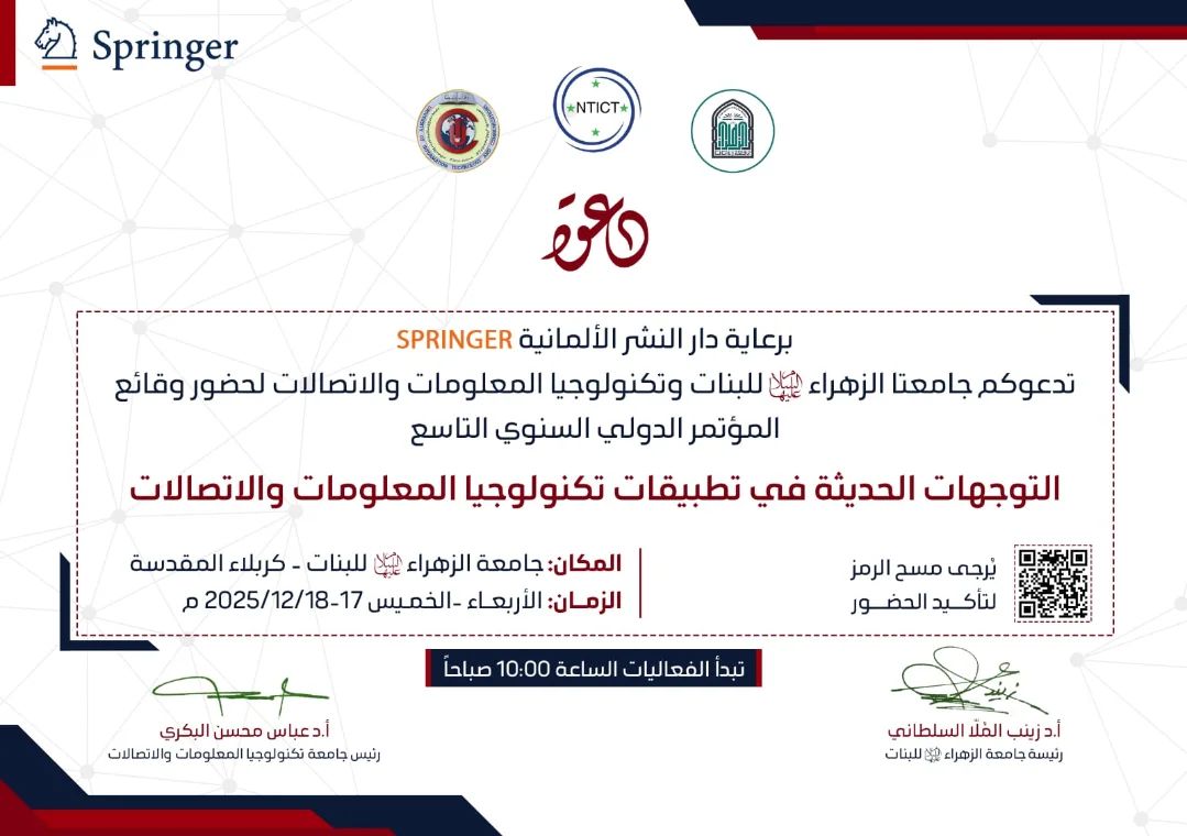 جامعة الزهراء (ع) للبنات تستضيف المؤتمر الدولي التاسع بالتعاون مع جامعة تكنولوجيا المعلومات والاتصالات وبمشاركة عالمية وبرعاية Springer.