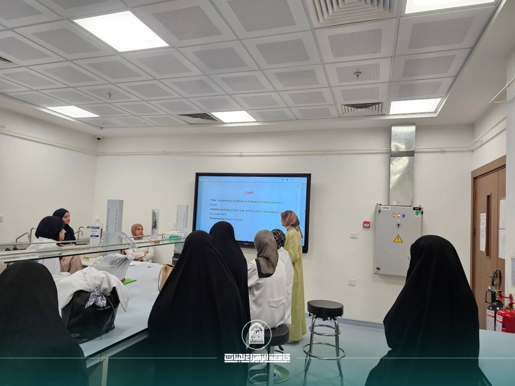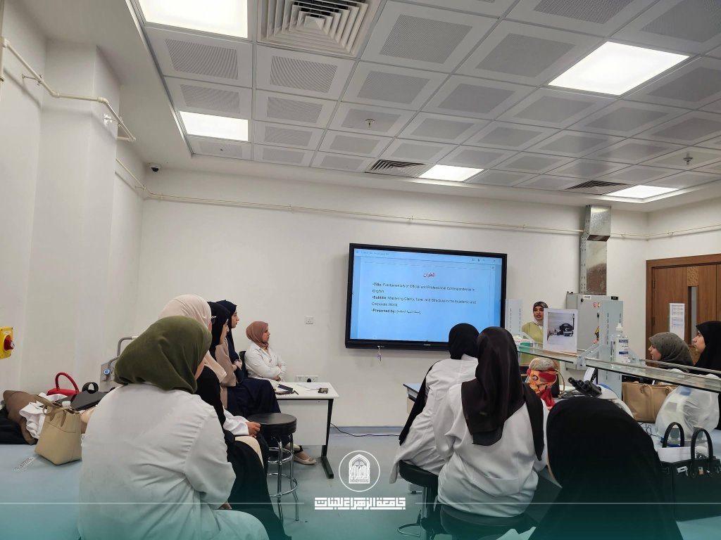 في إطار سعيها المستمر للارتقاء بالمستوى الأكاديمي والمهني لطلبتها، نظّم قسم التغذية العلاجية في كلية التقنيات الصحية والطبية بجامعة الزهراء (عليها السلام) للبنات ورشة تخصصية بعنوان “أصول المراسلات الرسمية والمهنية باللغة الإنجليزية”، قدّمتها التدريسية م.م. مريم عبدالوهاب عثمان.
