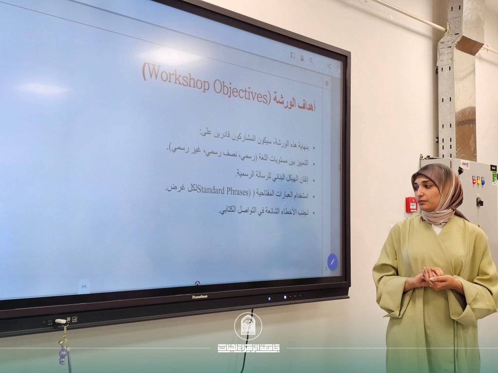 هدفت الورشة إلى تنمية مهارات الكتابة الاحترافية وتعزيز كفاءة التواصل باللغة الإنجليزية، من خلال عرض الأسس المعتمدة في إعداد المراسلات الرسمية والمهنية وفق معايير دقيقة تلبي متطلبات البيئة الأكاديمية وسوق العمل. كما تضمّنت محاور تطبيقية ركّزت على صياغة الرسائل بأسلوب واضح ومنظّم يعكس شخصية الكاتب ويعزّز حضوره المهني.