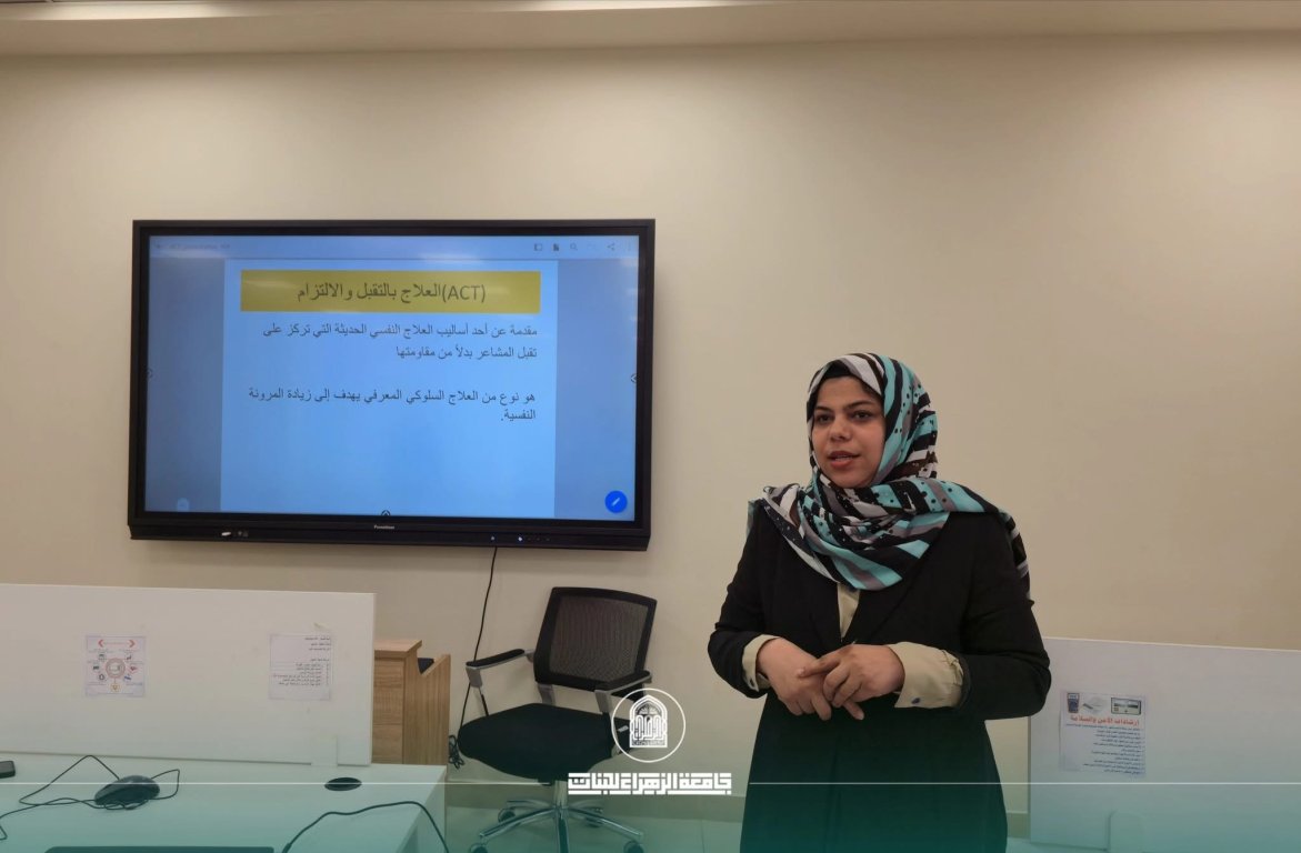 As part of its ongoing scientific activities aimed at enhancing psychological awareness and developing professional skills, the College of Health and Medical Technologies at Al-Zahraa University for Women organized a workshop titled “Acceptance and Commitment Therapy (ACT).” The session was delivered by Assistant Lecturer Samar Ali Mahmoud from the Department of Anesthesia, under the patronage of the University President, Professor Dr. Zainab Al-Sultani, and the supervision of the Dean of the College, Assistant Professor Dr. Ali Al-Khafaji, in collaboration with the Continuing Education Center.